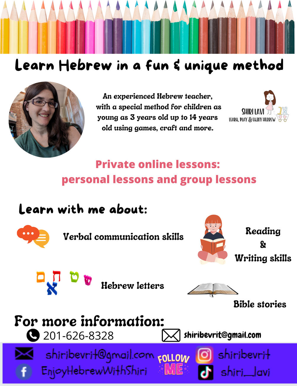 I offer online private lessons and small group lessons, learning resources and more.I have Be.d in education from Seminar Hakibutzim (Israel) and over 10 years of experience as a teacher.I teach children ages 3-14 years old using a special method with songs, stories, craft and lots of fun games.
